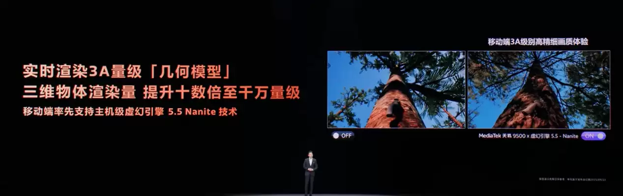 内容生态同步飞跃。天玑9500成为首款支持虚幻引擎5.5 Nanite和5.6 MegaLights的移动芯片:前者实现千万级几何细节实时渲染,后者支持数百个动态光源,为手游带来媲美PC级的视觉盛宴。