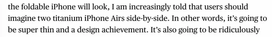 而根据 Mark Gurman 描述的情况,消费者们可以期待折叠屏 iPhone 会像「两个钛合金 iPhone Air 并排」那样,整体呈现一种超薄的观感。他还提到,折叠屏 iPhone 会是苹果的一项「设计成就」。