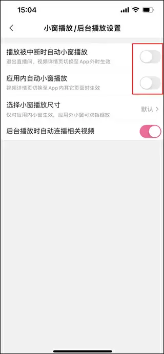 5、最后找到"播放被中断时自动小窗播放"和"应用内自动小窗播放"两个选项,关闭右侧的滑动开关即可完成设置。