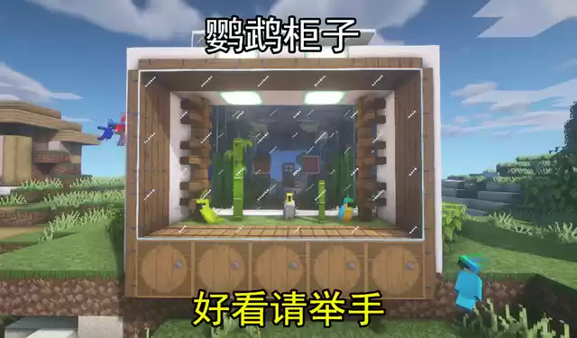 用玻璃方块将整个展示柜封闭起来,别忘了在底部放一排木桶增加储物功能,并用云杉木活板门完善整体造型,让你的鹦鹉展示柜既美观又实用。