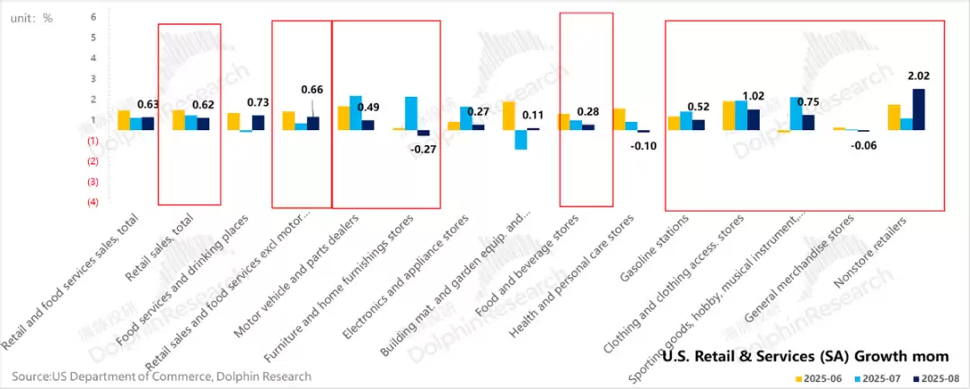 b. 当下经济进展:CPI还在底部回升,社会消费也不差——美国8月社零环比增长0.63%,剔除机车部件、加油站、建材等核心零售环比增长0.72%,社零表现非常不错。