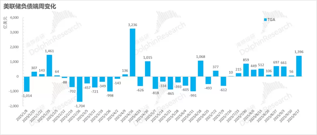 但在货币和财政的配合之下,这一风险看起来已经安然度过:上周趁着美联储预防式降息的利好,财政部趁着美联储降息交易、行情激亢的利好对冲,9月17日周财政部火速捞钱融资,单周直接把TGA账户补充了1400亿美金(25年1月底和4月初TGA的增加高峰,更多是和居民纳税季有关)。