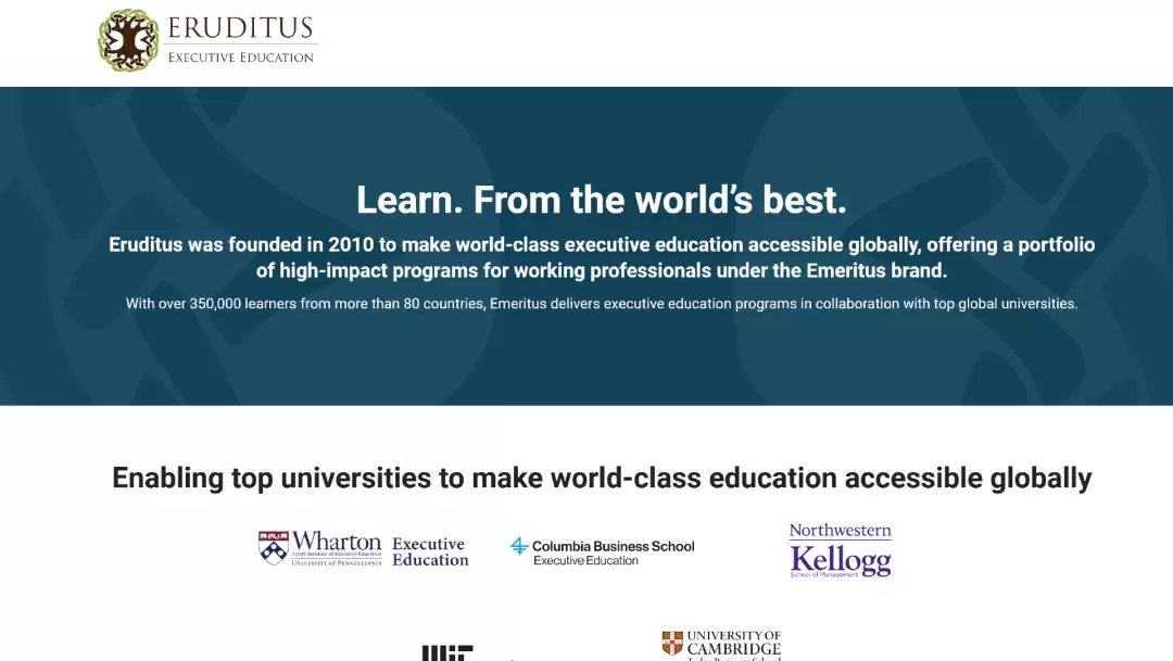 Eruditus 成立于 2010 年,长期专注高管教育,与麻省理工、哈佛、剑桥、欧洲工商管理学院、沃顿商学院等 80 多所全球知名高校合作,提供 700 多个项目,覆盖短训、学位和高管培训,学习者遍布 80 个国家,超过 100 万人。