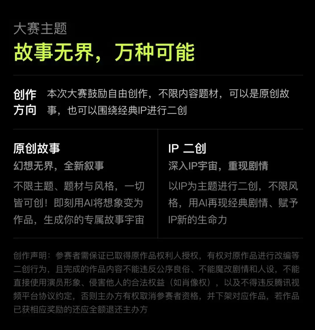 腾讯视频的动作同样值得关注。其首届AI短片大赛不仅设置奖金池,还在内容上强调原创故事与IP二创的双管齐下,直接指向AI作品与长视频生态的深度融合。更关键的是,腾讯首次提出流量倾斜、分账合作以及后续开发合作机会,这意味着优秀AI作品可能不再止步于“实验短片”,而是直接进入剧集、综艺、互动影视等更大体量的生态。