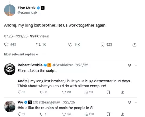 马斯克对顶级人才有多谦逊?为了请特斯拉前Autopilot业务负责人卡巴奇(Andej Karpathy)回来,马斯克甚至公开称卡巴奇是“自己失散多年的兄弟”,恳请他回来和自己一道共事。这或许是他最谦卑主动的一刻,仅次于对特朗普总统的“直男之爱”。