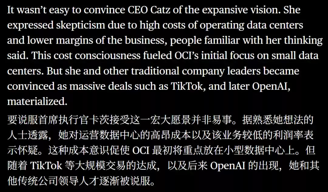 另一方面,据彭博社此前报道,在OCI早期,由于运营数据中心成本高、利润率较低,Catz对云基础设施业务持怀疑态度。