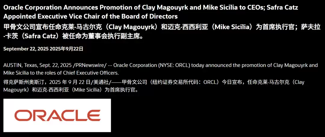 接替她的,是甲骨文云基础设施总裁Clay Magouyrk和甲骨文行业总裁Mike Sicilia,再次恢复双CEO制。