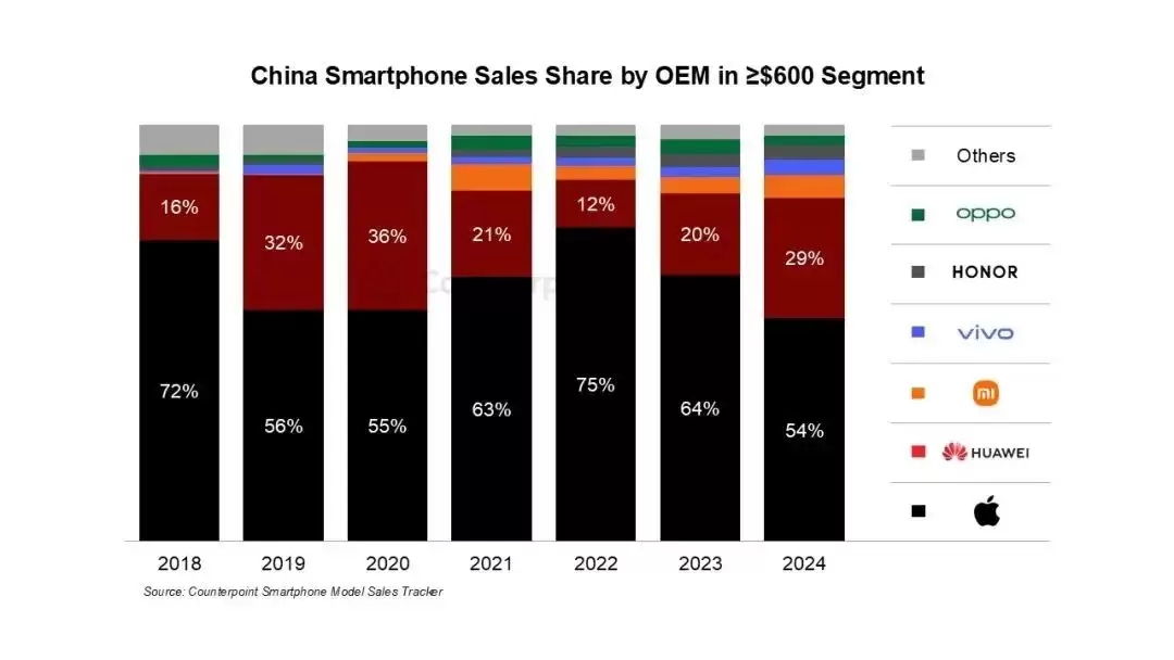 此外,小米、vivo、OPPO等国产厂商近年来也在加快对高端市场的布局,市场份额增速显著。数据显示,这些厂商在600美元以上价位的高端市场的集体份额,从2020年的5%提升至2024年的15%。在400-600美元价位段,国产厂商的集体份额更是从2024年的89%提升至2024年的91%。