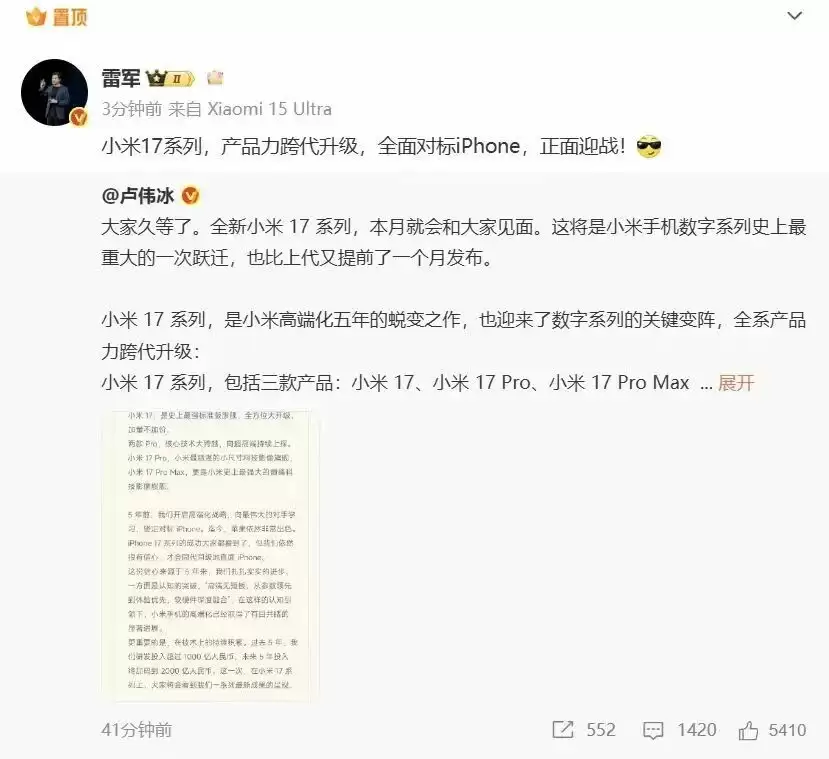 首当其冲的是小米。在苹果发布会5天后,小米集团总裁,手机部总裁,小米品牌总经理卢伟冰发文称,全新小米17系列将在本月发布。随后,雷军转发并称:小米17系列,产品力跨代升级,全面对标iPhone,正面迎战。