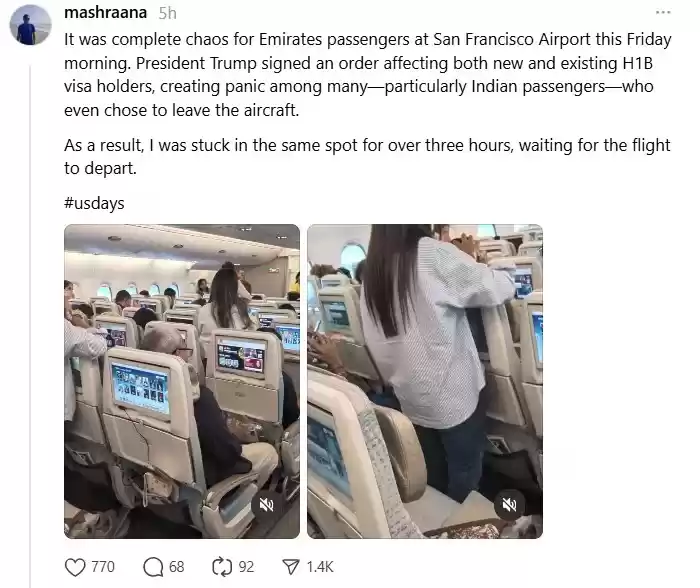 上周五晚,在特朗普签署 H-1B 新令不久,旧金山飞往印度的联合航空航班客舱内开始出现恐慌情绪。