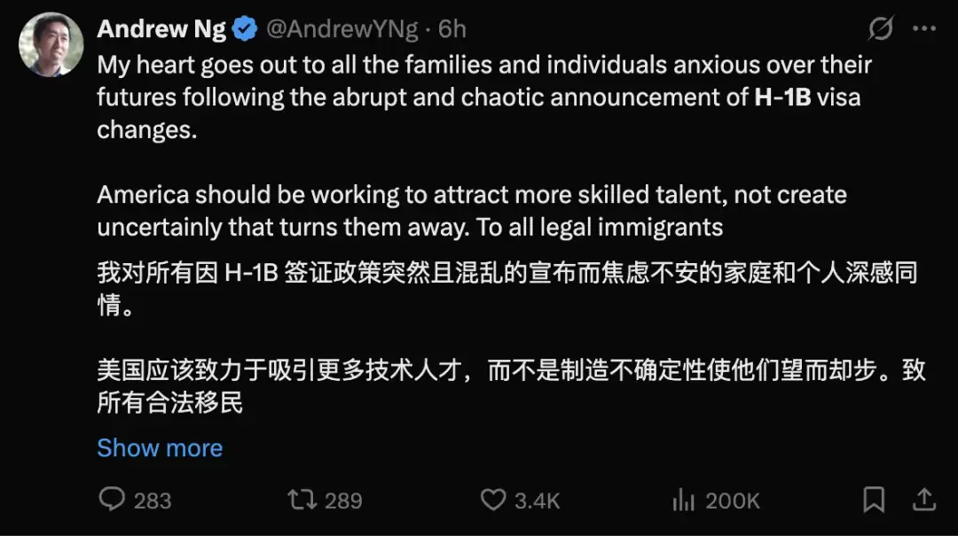 前谷歌大脑负责人吴恩达认为应当对所有在这次H-1B新政策中感到焦虑不安的家庭和个人深表同情: