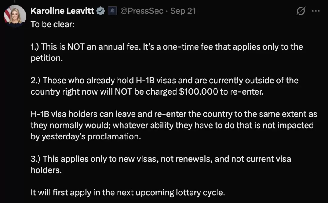21日,白宫发言人Karoline Leavitt也在X平台上表示,该政策将从下一轮H-1B抽签周期开始实施,并作了三点说明: