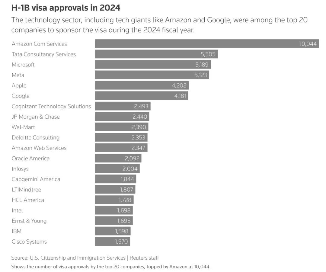 2024年前20家公司H-1B签证批准数量,亚马逊以 10,044 位居榜首
