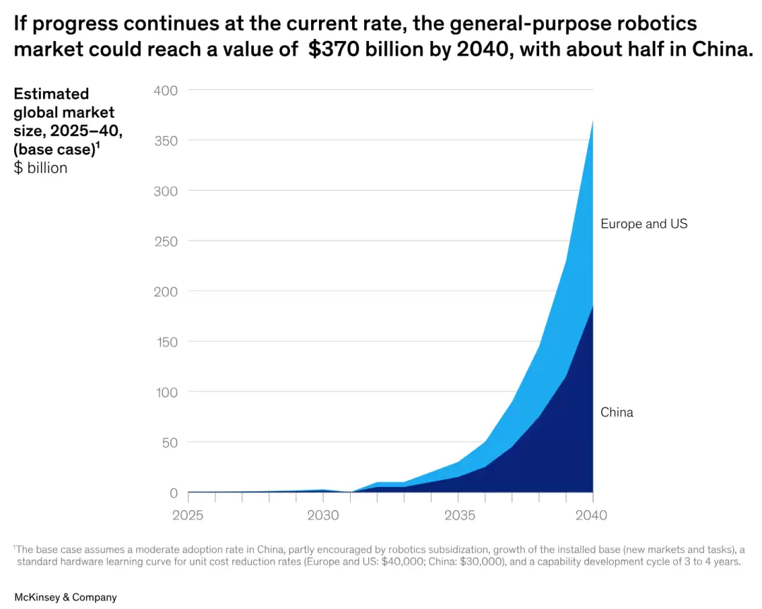 不可否认的是,中国在全球具身智能的发展中,承担了半壁江山的作用。根据麦肯锡的分析,按照现有趋势发展,到2040年全球具身智能的市场规模将达到3700亿美元,中国市场占据50%的份额。