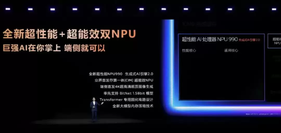 天玑9500采用超性能+超能效双NPU架构,其中超性能NPU 990集成了生成式 AI引擎2.0,支持BitNet 1.58bit推理架构,峰值算力达100 TOPS,较天玑9400提升111%,峰值性能功耗却降低了56%;超能效NPU引入存算一体芯片架构,支持Always-On低功耗AI任务,比如实时语音转文字速度较云端提升57%,唤醒功耗降低80%。双NPU架构可以让天玑9500实现“高性能运算”与“低功耗常驻”的全覆盖,让端侧AI应用从“尝鲜级”走向“实用级”。
