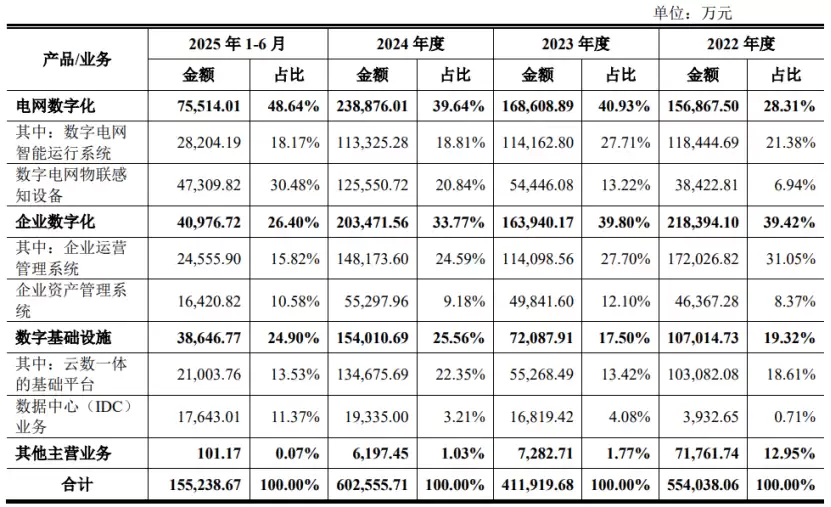 具体来看,2024年、2024年、2024年、2025年1-6月(简称“报告期”),南网数字的电网数字化业务营收占比呈上升趋势,企业数字化的营收占比有所下滑。