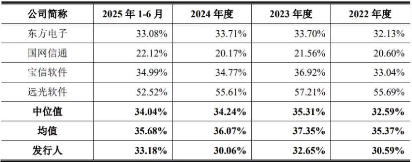 南网数字的综合毛利率低于同行业可比公司综合毛利率均值,其中,公司毛利率高于国网信通,低于远光软件,与东方电子和宝信软件处于同一水平,主要由于各自公司的业务结构及应用领域存在差异。