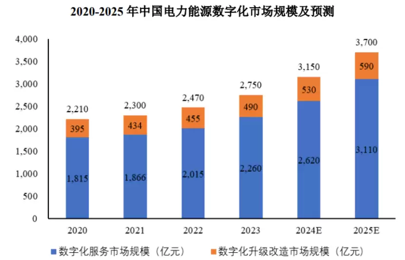 其中,数字化服务主要涉及智能电网、自动化控制、巡检运维、灵活性服务、能源管理系统等,2024年市场规模约2620亿元,占比约83%,且呈持续提升趋势,预计2025年数字化服务市场规模将达到3110亿元。