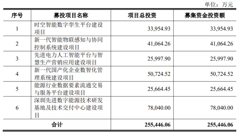 本次IPO,南网数字拟募集资金约25.54亿元,用于时空智能数字孪生平台建设项目、新一代智能物联感知与协同控制系统建设项目、先进电力人工智能平台与智慧生产营销应用建设项目、新一代国产化企业数智化管理系统建设项目、能源行业数据要素流通交易与服务平台建设项目、深圳先进数字能源技术研发基地及技术交付中心建设项目。