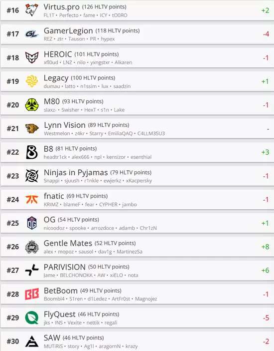 21-30名的角逐精彩纷呈:Lynn Vision维持在第21位,而Gentle Mates和PARIVISION表现抢眼,分别上升8位和6位。目前排名第30的是来自葡萄牙的SAW战队。