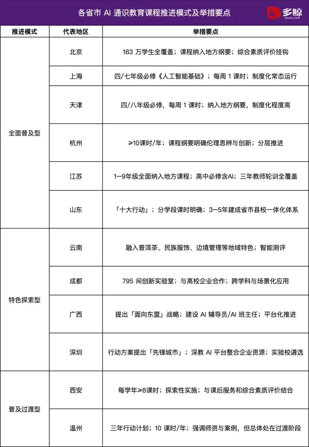 可以看到,从单一城市试点到多个省市系统推进,AI 通识教育在这个新学期呈现出明显的加速态势。