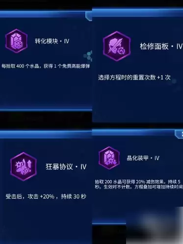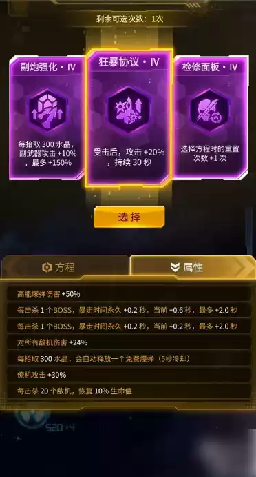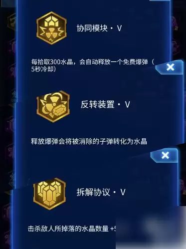 3、玩法:拿到狂暴协议,开始撞敌机子弹进行叠层,永世决意的被动,60%血量受击,不会一击必杀,所以,受击之后,击杀敌机,吃水晶进行回血,血量补足60%则再次受击,基本上40层就可以无痛过100波炼狱魔神,如果受击过程中不慎死亡,直接退掉游戏删除后台,重新进入,可以回到复活之前继续玩,前期尽量多拿回血与免伤,40%以上的回血,就足够叠层,免伤最高可叠76%,70以上的免伤,有比较大的概率可以受击四五次不掉血,对比回血受击,叠层会快很多,同时面对难打的boss,有更高的容错率,遇到boss在30秒内无法击杀时,必要可以死了复活,继续叠层,确保叠层不断,同时转换协议很重要,转换协议可以把敌方的弹幕变成水晶,当血量不足时,使用爆弹转水晶,可以补充血量,方便继续叠层,拆解协议提供的+50%水晶,可以让你更快升级,与回血,基本等于增加50%经验值,前期如果拿到,可以提供更多等级,可以选更多方程,其次就是新手战力低的,前期可以拿一些增伤方程,比如boss增伤,全体增伤,战机僚机副武器增伤,但主要还是以回血与免伤为主,其次就是爆弹CD,基本叠够300层左右,就可以通过333波,拿走全部奖励