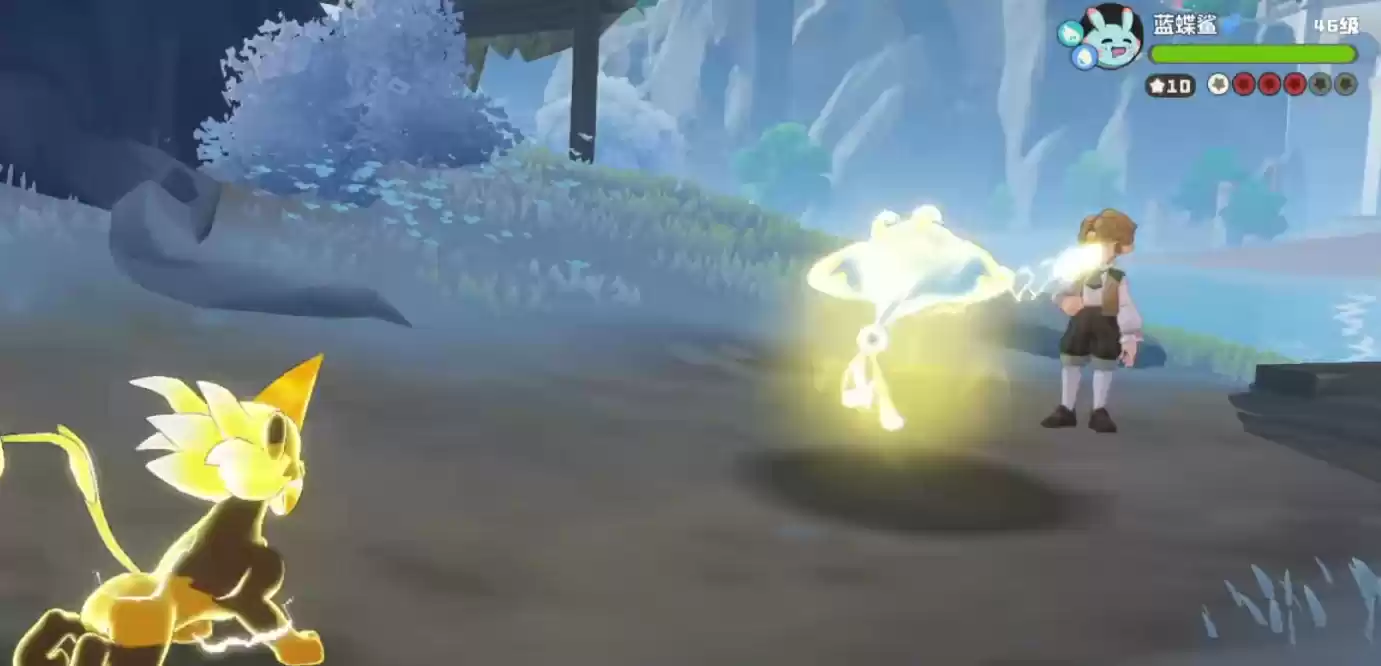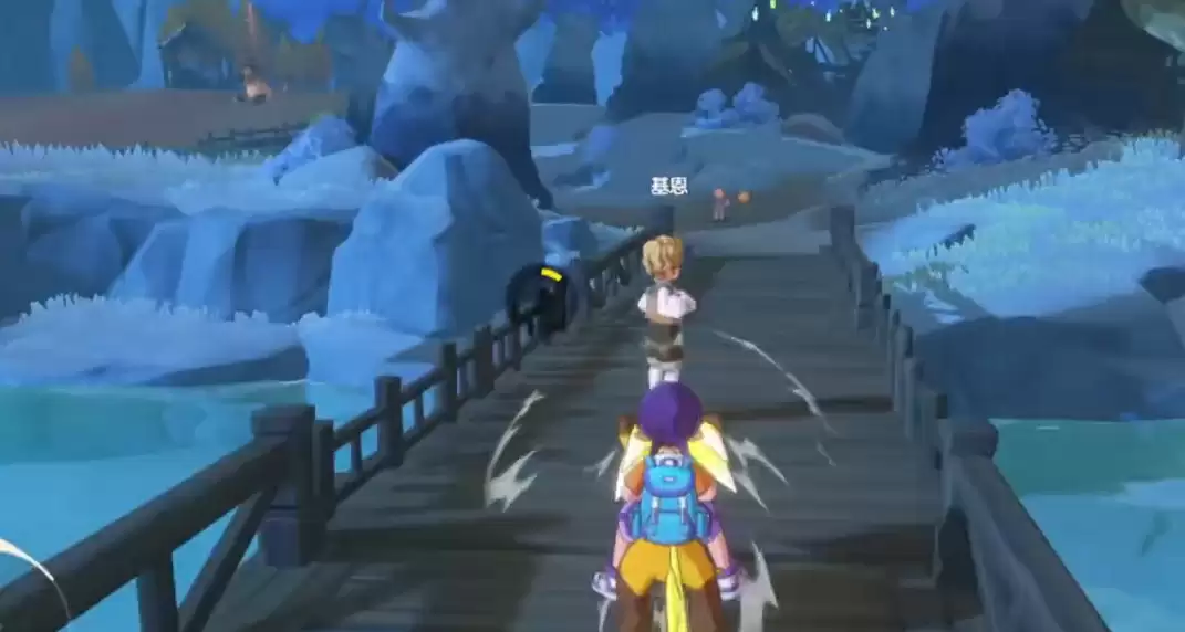 基恩位于寒霜村下方的桥上,各位可以先传送到甜水镇的魔力源,然后直接在地图上通过点击他的头像来实现追踪,让自己在跑图时能获得方向指引,更快地来到他的身边。等各位来到他所在桥上后,一眼就能看到,与他进行交互后便能开启露天对战。各位需与基恩连战两场才能真正赢下他,第一战他会上三只精灵,第二战则是四只,每一战都只需要打倒基恩上阵的全部精灵,令他的魔力值耗尽即可。战胜基恩后,各位可拿到羽毛、普系技能飞踢(三星)、地系技能震击(一星)和萌系技能月光合奏(四星)。