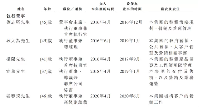 其中,45岁的刘志坚目前担任首席执行官、执行董事、董事会主席,他先后获得清华大学电子科学与技术学士学位、香港科技大学电机及电子工程硕士学位。
