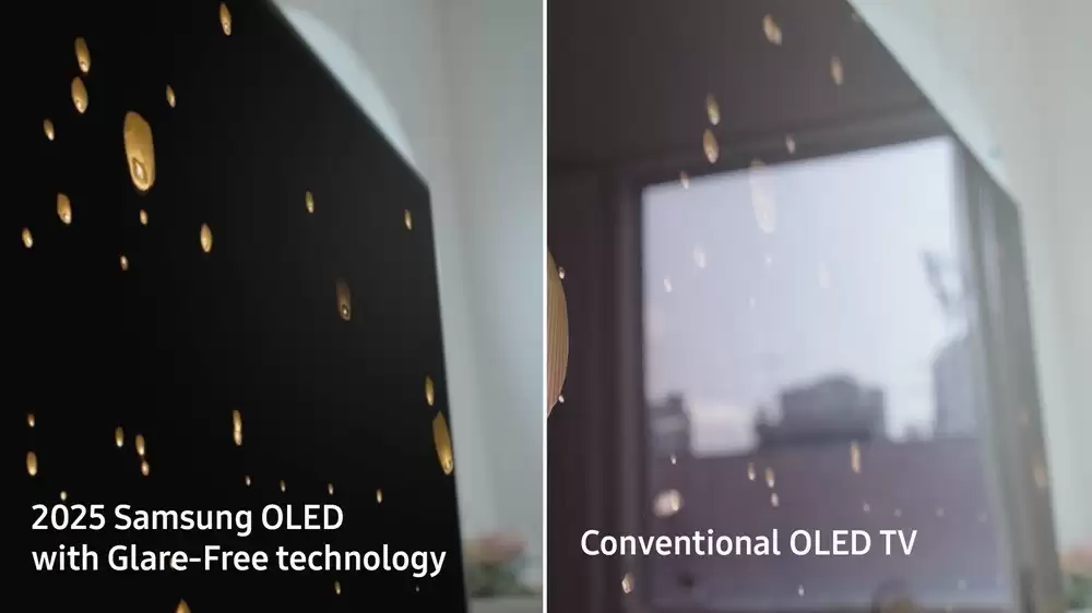 ▲ 示意图:明亮环境中搭载/未搭载防眩光技术的OLED效果对比。部分2025款三星OLED机型通过特殊低反射层,显著减少外部光源对观看体验的干扰。