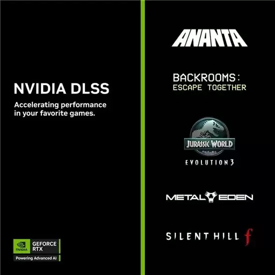 DLSS 4多帧生成技术为近期大作《无限大》(ANANTA)、《侏罗纪世界:进化3》(Jurassic World Evolution 3)、《后室:一起逃脱》以及《合金天使:堕入伊甸》(Metal Eden)带来显著性能提升。此外,《寂静岭 f》(SILENT HILL f)也在上周发布时同步支持DLSS超分辨率技术。