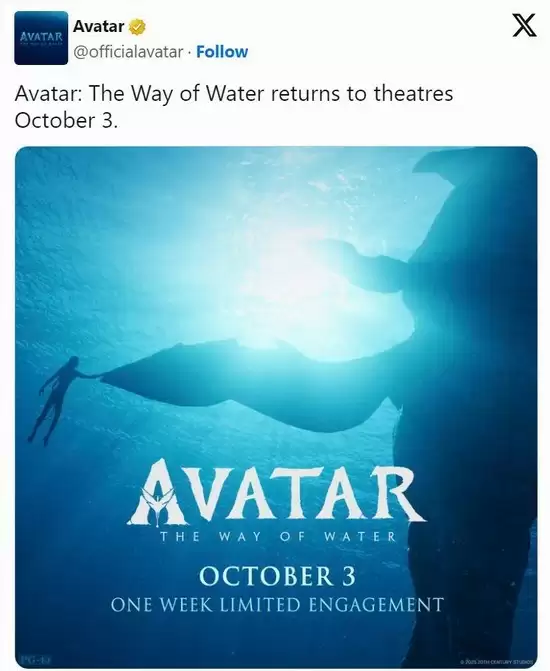 据悉,《阿凡达2》将从10月3日到10月10日开展为期一周的特别重映。尽管迪士尼尚未透露是否会包含未曝光片段,但影迷们依然可以期待在大银幕上重温3D和IMAX版本的震撼体验。