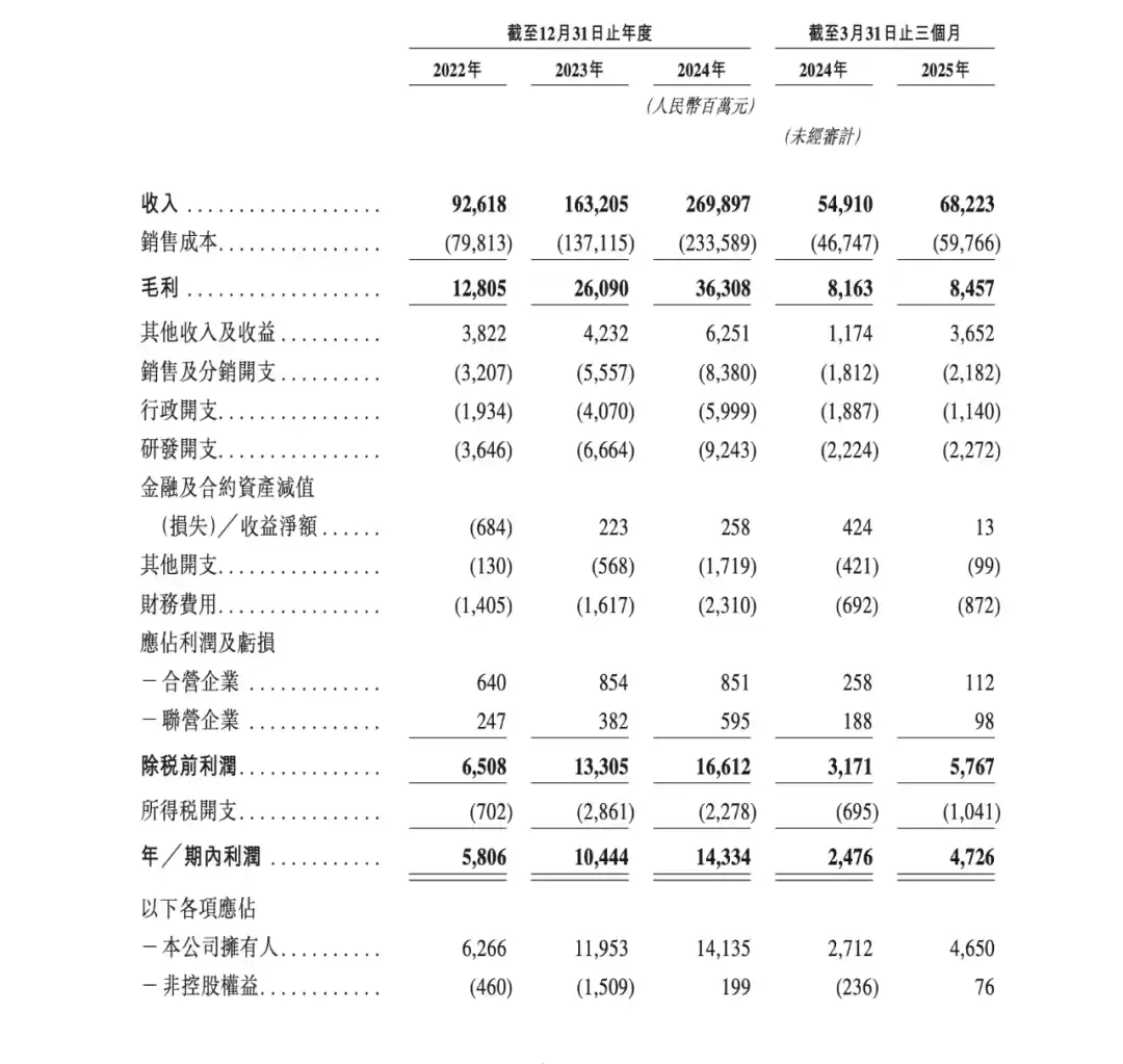 报告期内,奇瑞的收入分别为926.18亿、1632.05亿、2698.97亿、682.23亿元;毛利分别为128.05亿、260.90亿、363.08亿、84.57亿元,毛利率分别为13.8%、16.0%、13.5%、12.4%;期内利润分别为58.06亿、104.44亿、143.34亿、47.26亿元,净利润率分别为6.3%、6.4%、5.3%、6.9%;经调净利分别为58.06亿元、104.44亿、163.50亿、48.57亿元。