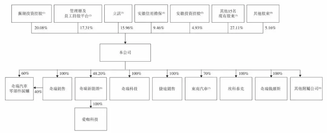 IPO后,芜湖投资控股持有奇瑞20.08%股份,瑞创持股10.92%,立讯持股15.96%,安徽信用担保持股9.46%,安徽投资控股持股4.93%,青岛五道口持股3.98%。