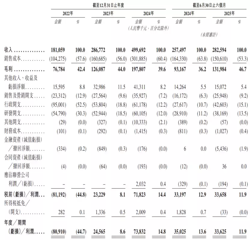 2024年、2024年、2024年、2025年上半年,赛美特的营业收入分别约1.81亿元、2.87亿元、5亿元、2.83亿元,毛利率分别约42.4%、44%、39.6%、46.7%,对应的净利润分别为-8091万元、2456.5万元、7383.2万元、3362.5万元。