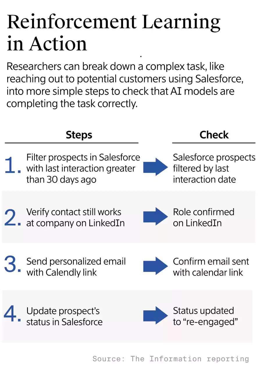 比如,要教会AI处理客户关系管理,不仅要教会它在Salesforce上搜索潜在客户,找出最有潜力的线索/客户并发送跟进邮件预约初次会面,还要教会它如何使用LinkedIn、Calendly、Gmail等应用。