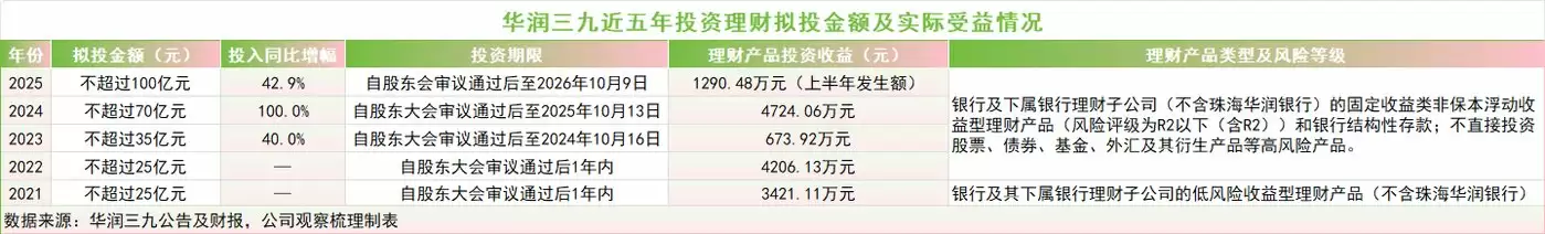 笔者梳理华润三九近5年理财产品拟投金额及年收益发现,自2024年以来,公司用于理财投资的额度从25亿元增至2025年的100亿元。