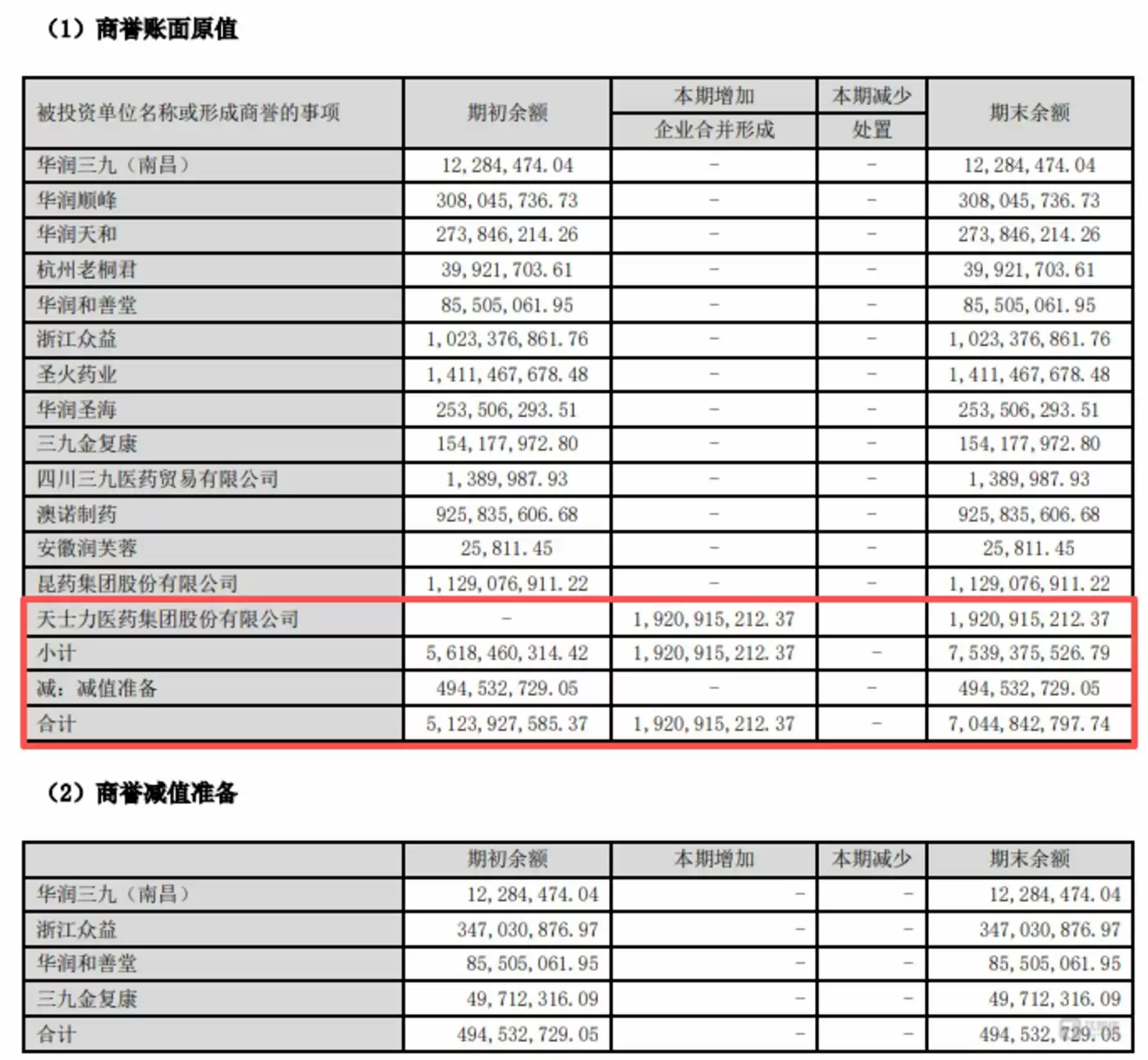 值得注意的是,华润三九近年来连续实施多项重大并购,2024年以29.02亿元收购昆药集团28%的股份,正式进军银发健康产业;2025年上半年又以62亿元完成对天士力的并表。截至中报,这些大手笔并购已形成70.45亿元商誉规模,仅天士力一项商誉就高达19.21亿元。