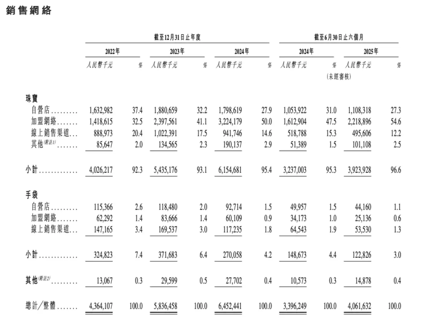 自2024年以来,潮宏基来自自营店的营收占比已经从2024年的37.4%下滑至今年上半年的27.3%;来自加盟网络的营收占比则从32.5%上升到54.6%。