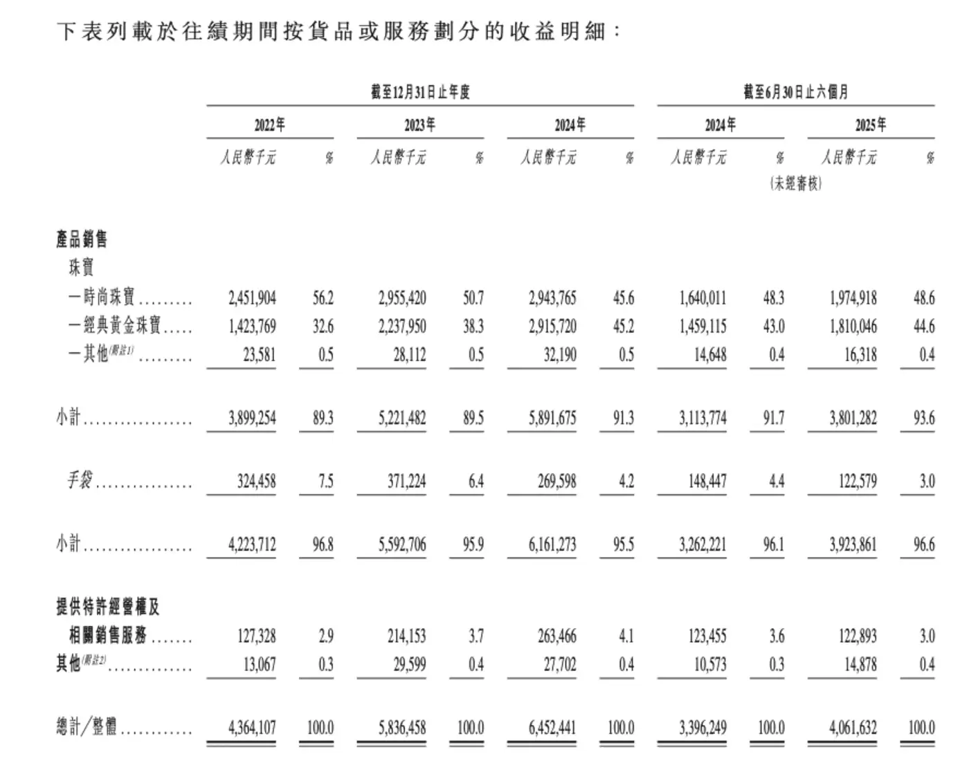 产品方面,潮宏基的营收主要来自珠宝(包括时尚珠宝、经典黄金珠宝及其他)的销售,营收占比分别为89.3%、89.5%、91.3%及93.6%。