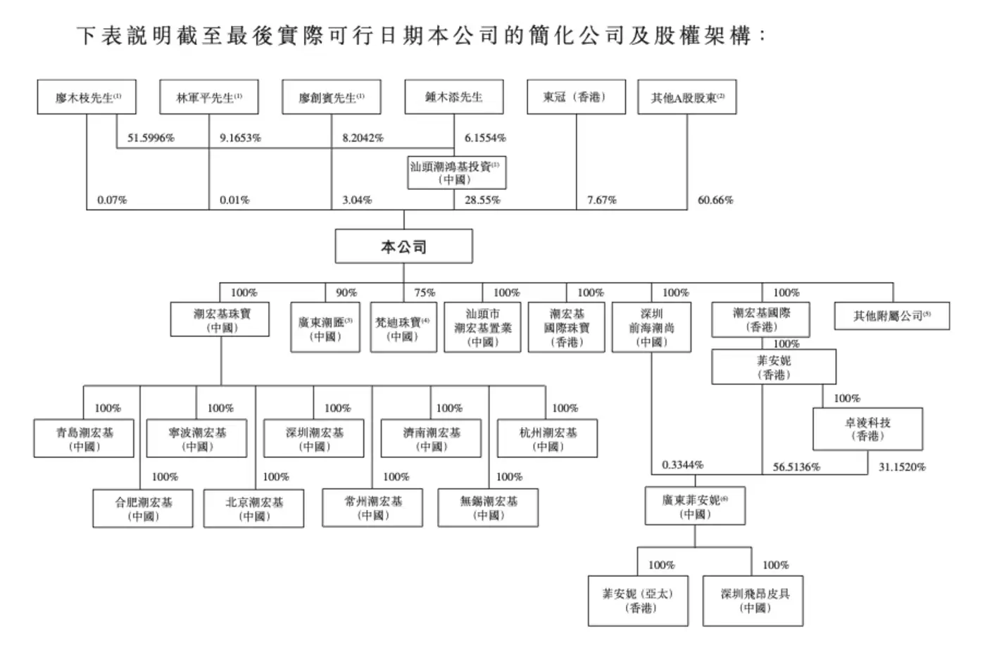 截至2025年9月5日,潮宏基在香港上市前的股东架构中,廖木枝、林军平、廖创宾为一致行动人士,合计持股约31.67%,为单一最大股东集团。廖木枝是廖创宾的父亲,也是林军平的岳父,三人构成一致行动关系。