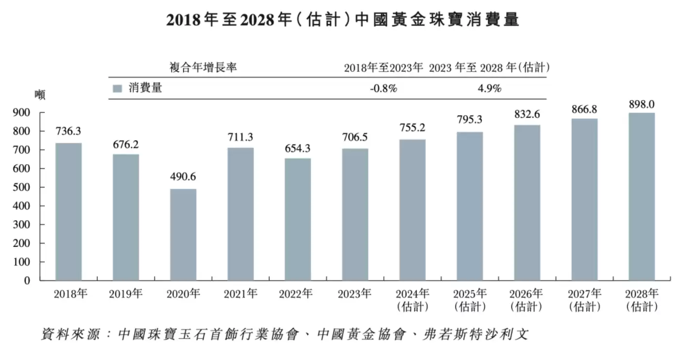 实际上,我国黄金珠宝消费量波动较大,2024年的消费量为706.5吨,不及2018年的736.3吨,中间多个年份的销量都处于同比下滑趋势。2018年—2024年的年复合增长率为-0.8%,常年的波动也让2024年—2028年的4.9%年复合增长率预期显得过于乐观。