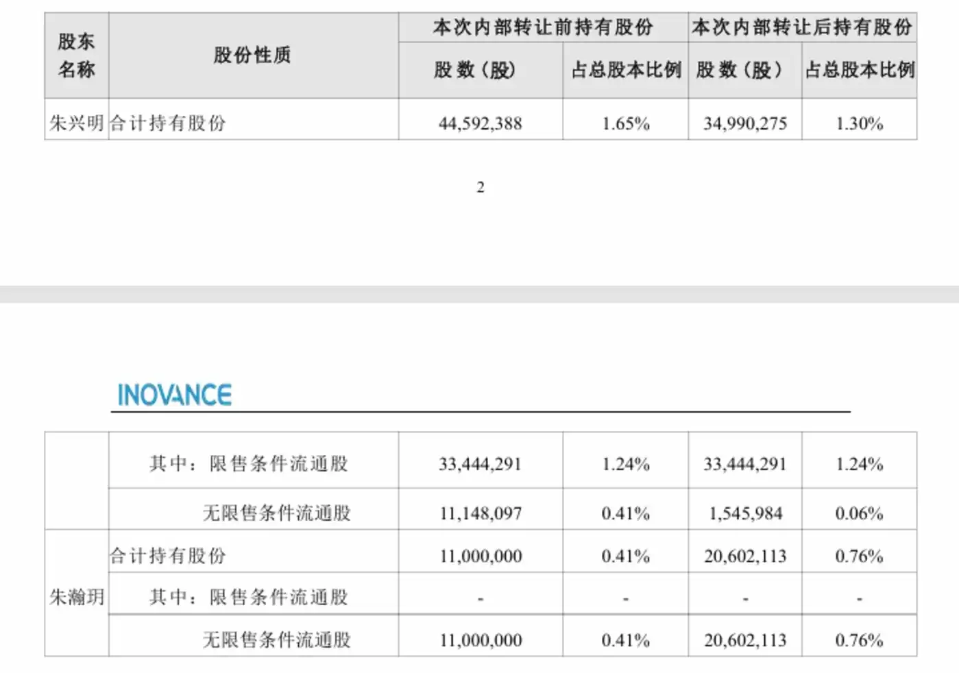 天眼查显示,前述汇川投资21.7029%股权已于2024年完成过户登记。相应的股份赠与,朱兴明分别于2024年12月、2025年9月以大宗交易方式,向朱瀚玥转让公司股份11,000,000股、9,602,113股,内部转让均价为62.06元/股、80.14元/股。