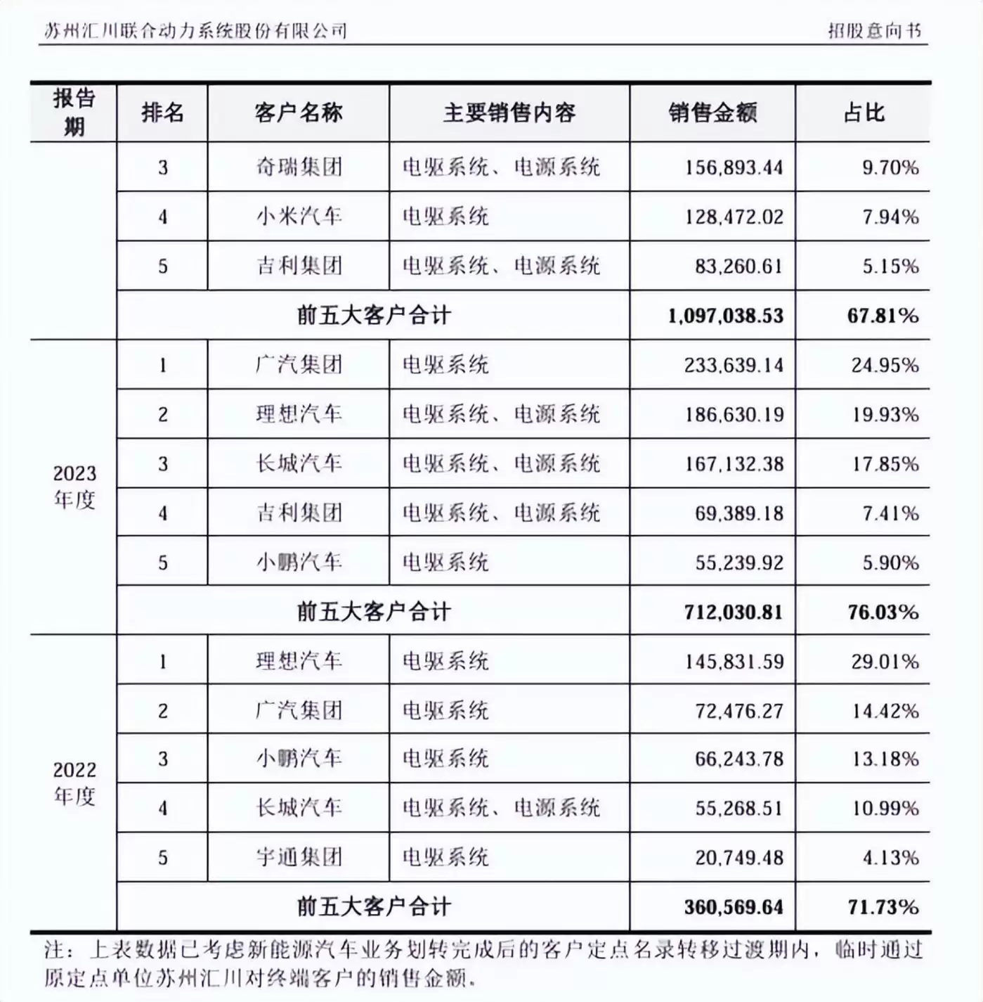 招股书显示,2024年至2024年,联合动力对前五大客户合计销售金额为36.1亿元、71.2亿元和109.7亿元,占总营收比例为71.73%、76.03%和67.81%。其中,理想贡献收入占总营收比例为29.01%、19.93%、34.69%,分别是公司的第一大、第二大和第一大客户。