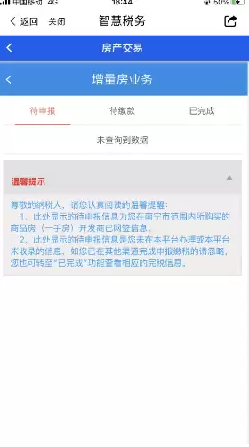 在爱南宁APP办理房产契税缴纳非常简单。打开APP后搜索"智慧税务"功能,进入房产交易版块选择"增量房业务",系统会清晰展示"待申报"、"待缴款"和"已完成"三个办理状态。首次办理的用户只需点击"待申报"填写相关信息并提交,申报成功后转至"待缴款"完成税款支付。若已完成申报但尚未缴费,则可直接在待缴款栏操作。缴税完成后,"已完成"栏次会自动生成电子完税证明供您下载保存。