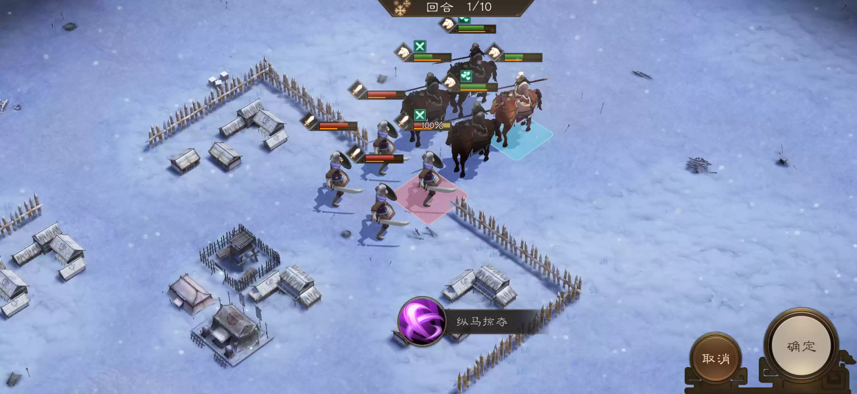 战斗初始配置:敌方派出4名刀兵,我方则有4名枪骑兵(半数血量)。建议配置120%物理伤害技能,同时具备夺取敌方增益效果的技能。