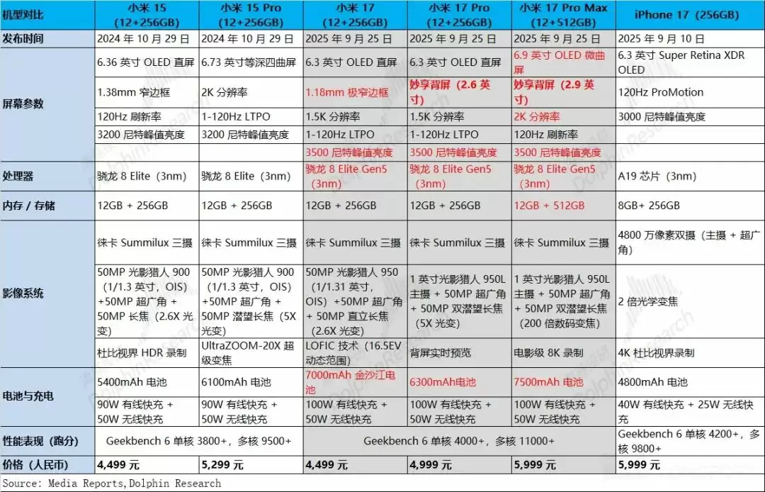 如果我们将小米 17 系列、小米 15 系列和 iPhone17 进行对比,可以发现: