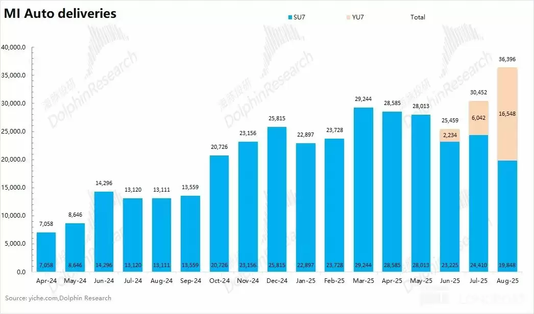 随着 YU7 的发布和二期工厂的量产,8 月份小米 YU7 的销量达到了 1.65 万辆,逐渐接近于 SU7 的月销量,两者合计的月度总销量已经达到 3.64 万辆。
