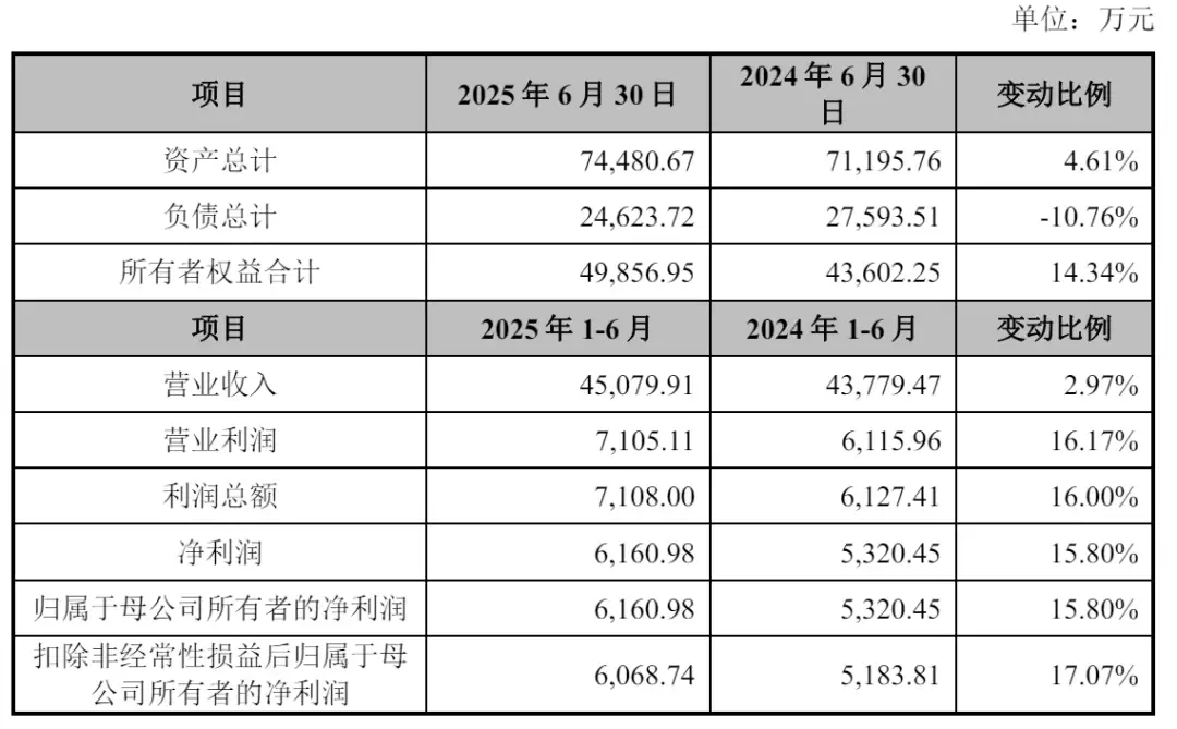 财务数据显示,2022-2024年公司营收持续攀升,分别为5.6亿元、6.72亿元和8.67亿元;净利润保持30%左右的年增速,对应实现6876万元、8741万元和1.11亿元。更值得关注的是2025年上半年业绩:在4.51亿元营收基础上,净利润6161万元实现15.8%同比增长,展现稳健发展态势。