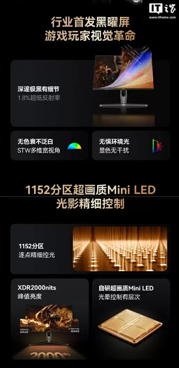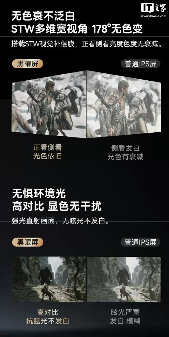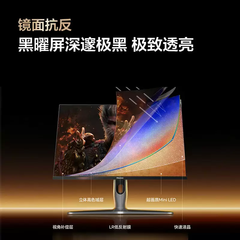 显示面板采用与旗舰电视同款的"黑曜屏"技术,通过内外双层纳米级LR低反射膜实现1.8%的超低反射率,即使在强光环境下也能确保游戏画面清晰可见。搭配STW多维宽视角补偿膜,178°超大可视角度有效解决了侧面观看时的泛白和色偏问题。