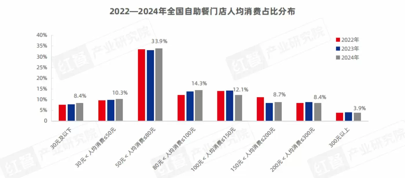 据红餐大数据显示,2024-2024年自助餐的人均消费有下滑趋势。截至2024年,全国自助餐人均消费在80元及以下的门店数占比为52.6%,比2024年提高了1.9个百分点;人均消费在100元及以下的门店数占比为66.9%,比2024年提高了2.4个百分点。